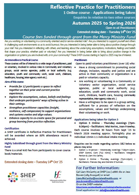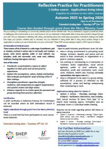 SHEP’s work in facilitating Reflective Practice is part of our broader intention to support practitioners and the systems they work in. It is a Continuing Personal and Professional Development. The next courses being offered commence in Autumn 2025. There are 3 courses: