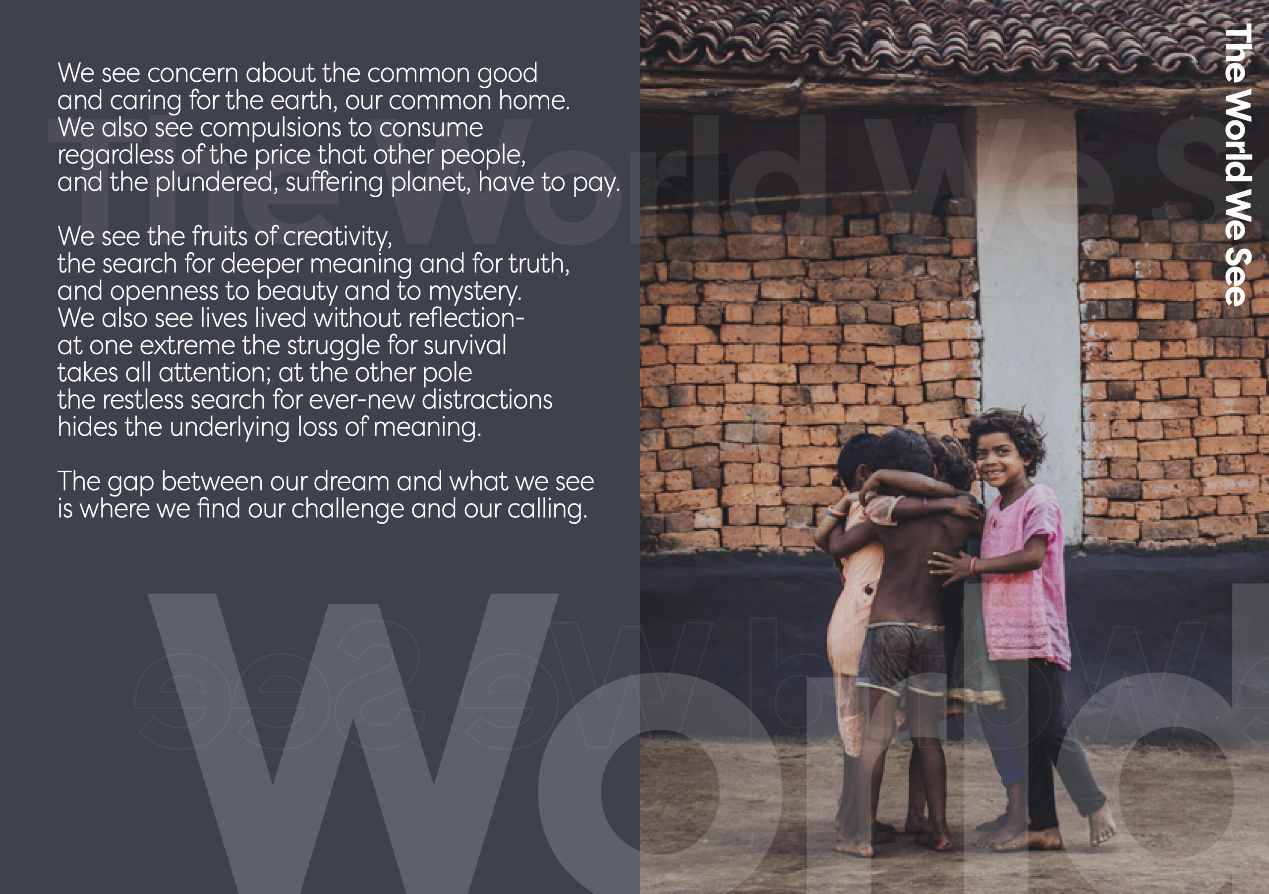 In solidarity and partnership with others we seek to foster the well-being of people, families, communities and the wider world and to contribute to building a healthy, loving, socially just and sustainable way of living.